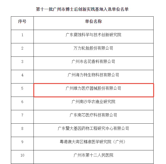 3月29日,廣州市人力資源和社會保障局發(fā)布《關于公布第十一批廣州市博士后創(chuàng)新實踐基地名單的通知》。此次評審設立了嚴格的評審標準和程序,經(jīng)單位申報、主管部門審核、專家評審、市人力資源和社會保障局核準和公示,維力醫(yī)療作為32家單位之一,獲批成為廣州市第十一批博士后創(chuàng)新實踐基地。